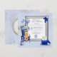 Vintage baby in royal blue diaper with crown. He is sitting on a royal blue and silver velvet throne with a banner that reads 1st Birthday with a bouquet of balloons tied to the chair. The frame is embellished with a royal blue ribbon and rose. Personal message is found on the scroll in the box on the bottom right. Perfect for a special little prince! Place for the birthday boy's photo on the back.