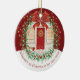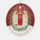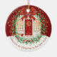 To celebrate the first Christmas in a New Home. This cute ceramic ornament was designed for a single person. A red door sits in the centre of an attractive holly wreath. Warm lights shine in windows on both sides of the door and a single robin sits on the holly leaves. A large red bow illustration just above the door finishes off this elegant design. The back of the ornament is red and has the same holly wreath and robin. The centre is left blank for your personal message. The front can also be personalized. A lovely memory of a first New Home Christmas.