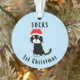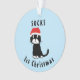 Image of a cat wearing a christmas hat. All text can easily be changed. On the reverse side the cat looks annoyed that you dared to put a hat on him/her. Date is also on the reverse side.