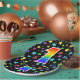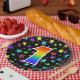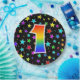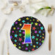 This cheerful, colourful, and fun paper plate design features a large number "1" having a rainbow spectrum gradient inspired pattern colouring. The background features a pattern of colourful star shapes. Paper plates like this might be fun to use at a celebration being held to honour somebody who is celebrating their first birthday, or a couple’s first anniversary, or some other 1st event. [~Z0000493]