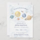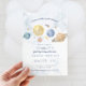 First Trip Around the Sun Birthday Invitation featuring moon, planets, stars and a little rocketship. Perfect 1st birthday party theme for your baby turning one! You'll be over the moon excited to celebrate. All text is editable - personalize for your party.