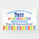 This adorable 2022 kindergarten graduation banner features a cool grad cap above colourful writing and a row of crayons in rainbow. Cute kindergartner graduate sign in fun colours for the last day of elementary school with your kid's name personalized in white. Congratulations to our kinder graduates!
