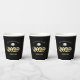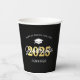 Custom graduation party paper cups featuring a graduate cap, 2023 in faux gold foil, school name, students name, and the word graduate in a script font.