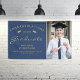 Celebrate your graduate's milestone in style with this graduation party banner. The left side features the words "Congratulations to our Graduate" in gold-coloured text decorated with a pair of gold mortar board caps on a navy blue background, while a vertical photo of the grad appears on the right. Personalize it with your grad's name, school, and year of graduation.