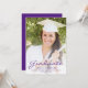 Modern graduation announcement featuring a custom vertical photo. The word "Graduate" appears in purple script, with the graduate's name, school and year of graduation below in sans serif font. Easily replace the sample image with your own graduate's photo. A white gradient screen helps ensure the text pops. Add details about your graduate's accomplishments and future plans on the reverse in white text on a solid purple background. Ideal for high school or college graduation.
