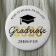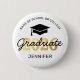 Custom graduation button featuring a graduate cap, 2025 in faux gold, school name, students name, and the word graduate in a script font.