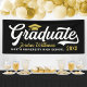 Graduation party banner feature a simple and stylish typography design with scholarly script "Graduate" wording and a grad cap with tassel accent. Personalize with your graduate's name, class year, and high school. Note, the gold, black, and white colours can be changed to match school or party colours.