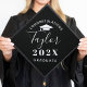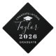 Stylish custom graduation cap topper design features modern and minimalistic style congratulations wording that can be personalized with your graduate's name in script and their graduation class year. Note, white text / grad cap image and black background colours can be modified.