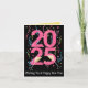 Colorful and bright on contrasting black night sky 2025 midnight champagne and party popper streamers New Year greeting card. Original art and design by www.mylittleeden.com