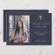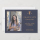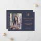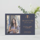 Modern formal elegant dark navy blue and gold nursing school graduation announcement card template with your custom photo and text.