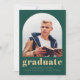 This simple, minimalist graduation announcement features an arch-shaped photo on the front and a horizontal photo on the back. The word "graduate" appears in bold gold-coloured typography, with the graduate's name, school and year in sans serif font on a dark green background. Add a more detailed message under the photo on the reverse.