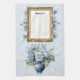 Blue rose 2026 damask calendar towel. Pretty vase of blue roses with "framed" 2026 calendar.