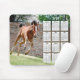 This picture depicts a brown colt with a white blaze on his face running through a grassy pasture. A brick wall is behind him. He has on a red halter. A 2026 calendar is located to the right of the colt. Get this calendar mouse pad for the horse lover in your life.
