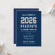 Celebrate your 2026 graduate with this modern, typography-forward graduation party invitation in navy blue with silver gray number styling. The clean layout features bold “2026” and “GRADUATE” lettering with space to personalize the graduate name, school, party details, and RSVP. A polished, easy-to-read design that works beautifully for high school or college celebrations. Great for graduation parties and open house gatherings.