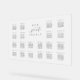 Our 20 table seating chart sign features handwritten calligraphy and classic typography printed on frosted acrylic for a minimal yet elegant way to have guests find their table at your reception or event.