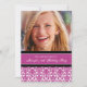 20èmes invitations de fête d'anniversaire de photo faite sur commande dans le rose fuchsia lumineux élégant, motif floral classique noir et blanc de damassé. Ajoutez votre nom, photo, et détails de partie pour 20ème une invitation unique et élégante de fête d'anniversaire.