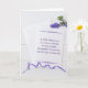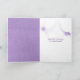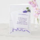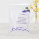 Purple ribbon and flowers on a white notecard on whitewashed wood for 20th anniversary.