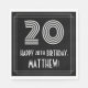 This Roaring Twenties inspired birthday paper napkin design features a large Art Deco look inspired number "20", the message "HAPPY 20th BIRTHDAY,", a custom name, and a border pattern consisting of lines. Fun, personalized paper napkins like this might be used at a celebration being held to honour somebody’s 20th birthday. [~Z0000395]