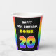 This fun and cheerful birthday themed paper cup design features the number “20“ with a vibrant multicolored rainbow spectrum inspired gradient pattern, along with the message “HAPPY 20th BIRTHDAY,”, and a custom recipient name. Birthday themed paper cups like this might be a fun way to celebrate somebody’s 20th birthday. [~Z0000639]