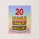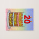 This fun and upbeat birthday themed jigsaw puzzle design features a cartoon-style depiction of a three-tier birthday cake having number-shaped candles on top showing the age “20“, along with the message “HAPPY 20TH BIRTHDAY,”, and a custom recipient name. The background has a multicolored pastel rainbow spectrum inspired gradient pattern. A cheerful, customized birthday puzzle like this might be given to celebrate somebody’s twentieth birthday. [~Z0000621]