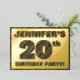 The front of this bold twentieth birthday party/celebration foil invitation card features a customizable name, a large number “20th”, the message “BIRTHDAY PARTY!”, and a border, all featuring a rustic, yet sophisticated, faux wood grain appearance inspired pattern. The back features personalized details about the event, such as the date, time, venue/place, and any other information that may be useful. Personalized invitations like these might be used to invite attendees/guests to a birthday party being held to honour somebody’s 20th birthday. [~Z0000595]