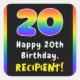 This exciting and eye-catching birthday-themed square sticker design features a big number “20“ having a multicolored rainbow spectrum inspired gradient pattern, along with the message “Happy 20th Birthday,”, and a customizable recipient name. Birthday themed stickers like these might be used or distributed at a party celebrating somebody’s 20th birthday, or perhaps used when preparing invitations or wrapping gifts for such an event. [~Z0000630]