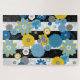 Bold graphic flowers in blue and yellow sit on a striking black and white striped background. Great puzzle for someone living with the most common form of colour blindness.