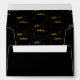 Outside: black background colour. Back: template for a name and address. Golden text. Inside: Black background and faux gold text written with a trendy hand-lettered style script: hello twentyone. With golden dots as decor. A cool and trendy envelope for your 21st birthday party invitations, save the dates or thank you cards,