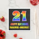 This cheerful, fun, and colourful birthday paper napkin design features a large number "21" and the message "HAPPY BIRTHDAY,", both having a rainbow spectrum gradient inspired pattern colouring, along with a bold yellow custom recipient name. The background is coloured black. Birthday themed paper napkins like this might be fun to use at a party being held to celebrate somebody’s 21st birthday. [~Z0000476]