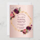On front: An invitation for a 21st birthday party. An elegant and trendy rose gold faux metallic looking background with a faux gold geometric frame. Decorated with dark purple and burgundy flowers, roses and boho style feathers. Templates for a name and party details. The name is written with a hand lettered style script, purple coloured letters.