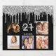 For a 21st birthday party, celebrating her life with a collage of 5 of your own photos. Personalize and add a name, age 21 and a date. Date of birth or the date of the party. White and grey coloured letters. Classic black background colour, decorated with faux silver glitter drips, paint dripping look.