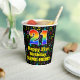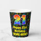 This colourful and joyful music-themed birthday paper cup design features a large number “21” having a rainbow spectrum gradient inspired pattern. It also features the message “Happy 21st Birthday,”, and a personalized name. The background features a multicolored pattern of various music notes and symbols having a variety of colours and sizes. Colourful, vibrant paper cups like this might be fun to have at a birthday party being held to honour somebody’s 21st birthday. [~Z0000541]