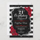 Elegant black white red design with faux glitter. Black and white stripes with red roses. Perfect for an elegant birthday party.