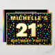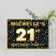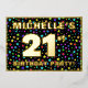 The front of this vibrant twenty-first birthday party foil invitation card design features a personalized name, a large number “21st”, the message “BIRTHDAY PARTY!”, and a border. The background of the front has an exciting, colourful stars pattern. The back features personalized details about the event, such as the date, time, venue/place, and any other important information. Customizable invitations like these might be a fun way to invite attendees/guests to a birthday party being held in celebration of somebody’s 21st birthday. [~Z0000600]
