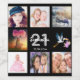 A bottle label for a 21st birthday party, celebrating her life with a collage of 8 of your photos. Templates for a name, age 21 and a date. Date of birth or the date of the party. White and grey coloured letters. Elegant black background colour.