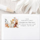 Modern and elegant white pumpkin and fall flowers floral design. The soft watercolor palette is a sophisticated blend of soft pink and dark rich golden yellow and brown. The fall leaves surround the white pumpkin for a special autumn display. Perfect for your fall birthday party.