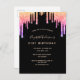 A girly and feminine 21st birthday party invitation. On front: A chic black background. Decorated with faux glitter drips, paint dripping look in purple, pink and faux gold and rose gold. Personalize and add a name and party details. The name is written with a hand lettered style script, light rose gold coloured letters.