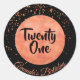 An elegant and glamourous sticker for a 21st birthday party for a girl. A chic black coloured background. A large rose gold coloured circle with modern hand lettered style text: Twentyone. Golden confetti shower, rain as decoration. Template for a name, curved text.
