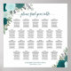 Add charm and sophistication to your wedding reception with this beautiful wedding seating chart, adorned with a rustic watercolor boho chic floral design. With seating assignments for up to 220 guests, each table accommodating 10 seats, this seating chart features a rustic blend of roses and flowers in shades of teal, turquoise, aqua, and cyan, gracefully intertwined with sprigs of eucalyptus leaves and garden greenery. The elegant script calligraphy title adds a touch of glamour, creating a sophisticated atmosphere for your special day, and there is room for the couple's names and wedding date at the bottom.
