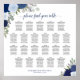 Ajoutez du charme et du raffinement à votre réception de mariage avec cet élégant tableau de sièges mariage, orné d'une aquarelle rustique boho design floral chic. Avec des places assises pouvant accueillir jusqu'à 220 personnes, chaque table de 10 places, ce tableau présente un mélange enchanteur de roses dans les tons bleu poussiéreux, bleu marine et indigo, gracieusement entrelacés par des pousses d'eucalyptus feuilles et de verdure du jardin. L'élégant titre de calligraphie script ajoute une touche d'opulence, créant une atmosphère sublime et gracieuse pour votre journée spéciale. Ce magnifique tableau de sièges ajoute une touche de beauté et de raffinement à votre réception de mariage, ce qui permet à vos invités de trouver facilement leurs tables désignées.