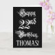 The front of this elegant and formal birthday greeting card design features the message “Happy 22nd Birthday,” in lavish script style text, on a black coloured background. The inside has an editable birthday greeting message, or could perhaps be cleared and left blank if a message is to be written by hand instead. An ornate, personalized birthday greeting card like this might be used to acknowledge somebody’s twenty-second birthday. [~Z0000554]