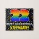 This colourful and vibrant birthday themed jigsaw puzzle design features a large number “22” having a multicolored rainbow spectrum inspired gradient pattern. It also features the message “HAPPY 22nd BIRTHDAY,”, and a custom recipient name. The background features an upbeat, multicolored star shapes pattern. A cheerful, editable birthday puzzle like this might be given in celebration of somebody’s twenty-second birthday. [~Z0000607]
