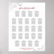This 23 table wedding seating chart features an elegant traditional design with dark gray and crimson red text on a white background and lacy silver gray faux foil frills in the corners. The script calligraphy title reads: Please find your table. Contains table assignments for 230 guests at 10 guests per table. Sophisticated and chic way to help your guests find their seats at your reception.
