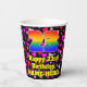 This joyful and colourful birthday themed paper cup design features a large number “23” having a rainbow spectrum gradient inspired pattern. It also features the message “Happy 23rd Birthday,”, and a personalized name. The background features a pattern of red, purple, and pink heart shapes of various sizes. Cheerful, fun paper cups like this might be fun to use at a birthday celebration/party being held to honour somebody’s twenty third birthday. [~Z0000548]