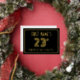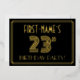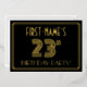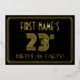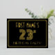 The front of this vintage-appearance and 1920s-1930s style inspired twenty-third birthday celebration/party foil invitation features an editable name, a large art deco style inspired number “23RD”, the message “BIRTHDAY PARTY!”, and a border pattern consisting of lines. The background of the front is coloured black by default, but it can be customized to a different colour if desired. The back features personalized details about the event, such as the date, time, location, and any other information that may be relevant. Elegant, luxurious, editable invitations like these might be used to invite guests to a birthday party being held to celebrate somebody’s 23rd birthday. [~Z0000590]