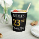This ornate and fancy birthday-themed paper cup design features a customizable name and the message “23rd Birthday Party”. The large number “23rd” has a faux/imitation gold-inspired coloring pattern, the words “Birthday Party” are in elegant script-style text, and the background is colored black by default (although it can be customized). Opulent, luxurious paper cups like this might be useful at a birthday celebration/party being held to honor somebody’s twenty third birthday. [~Z0000567]
