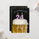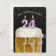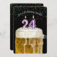 Number 24 candle in mug of beer with colourful confetti on black for 24th birthday party invite.