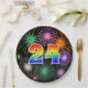 This fun, colourful, and cheerful paper plate design features a large number "24" having a rainbow spectrum gradient inspired pattern colouring. It also features a vibrant and exciting bursting celebratory fireworks inspired pattern. The background is coloured black. Fun paper plates like this might be used at a party being held to celebrate somebody’s 24th birthday, a twenty fourth anniversary, or some other 24th event. [~Z0000490]