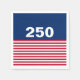 In celebration of America's 250th birthday, this paper napkin has a blue field at the top with 250 in white text. It has red and white stripes at the bottom that is reminiscent of the American flag.