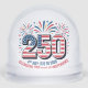Energetic fireworks burst behind the design, sending out red, white, and blue streaks and starbursts that amplify the excitement and commemorative energy. Clean vector lines and a bright flat white background make this a standout graphic.